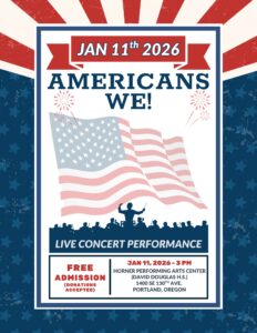 Sunday January 11, 2026 at 3PM, at the Howard F Horner Performing Arts Center, 1400 SE 130th Ave, Portland, Oregon. It’s on the northwest corner of David Douglas High School.